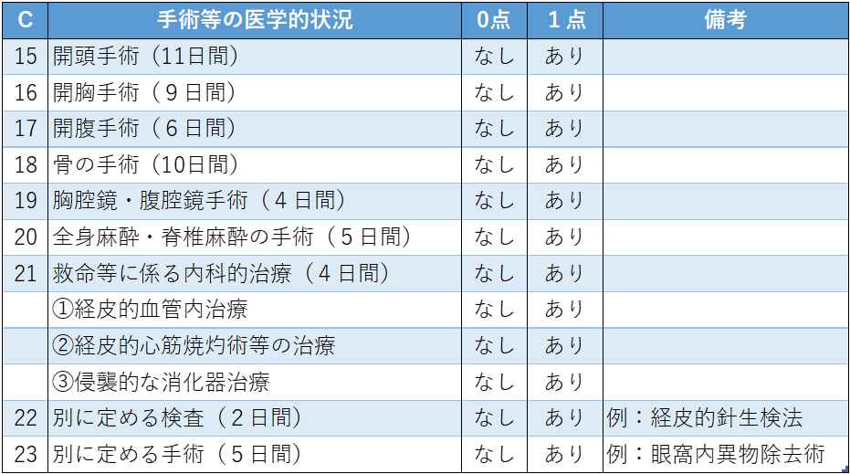 ・ C項目:手術や高度な医学的管理などの医学的状況