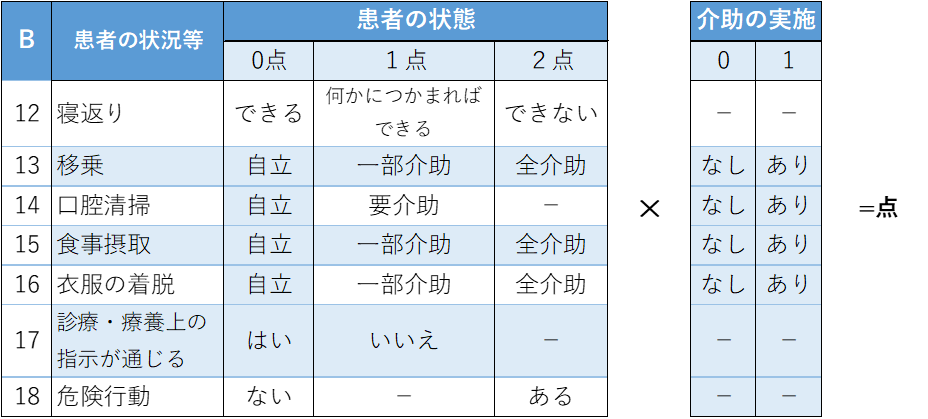 B項目は、患者さんの日常生活動作(ADL)や介助の必要性など、患者さんの生活面の状態を7項目で評価する項目です。