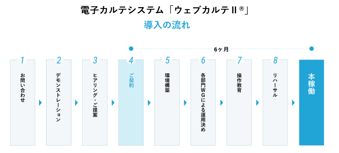 「ウェブカルテⅡ®」の導入から本稼働までの流れは、以下のステップで約6ヶ月かけて進行します。