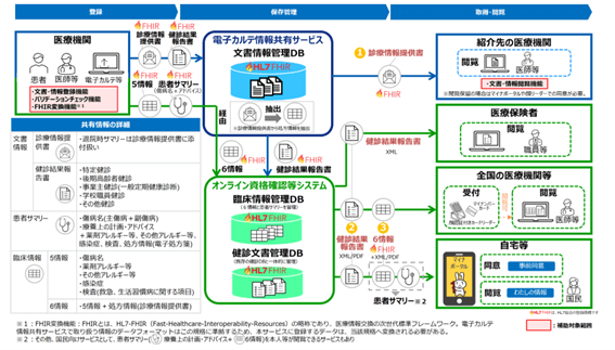 患者の6情報(傷病名・アレルギー・薬剤禁忌・感染症・検査・処方)を、全国の医療機関等や本人等がオンライン上で閲覧できるサービスです。