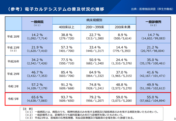 令和5年(2023年)時点での電子カルテの普及率は、一般病院で65.6%、一般診療所で55.0%となっています。